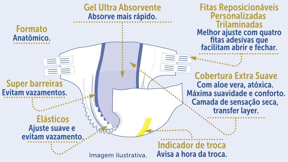 Nossas fraldas são hipoalergênicas e testadas dermatologicamente. São livres de perfumes agressivos e desenvolvidas especialmente para peles maduras e sensíveis, minimizando riscos de irritações.
